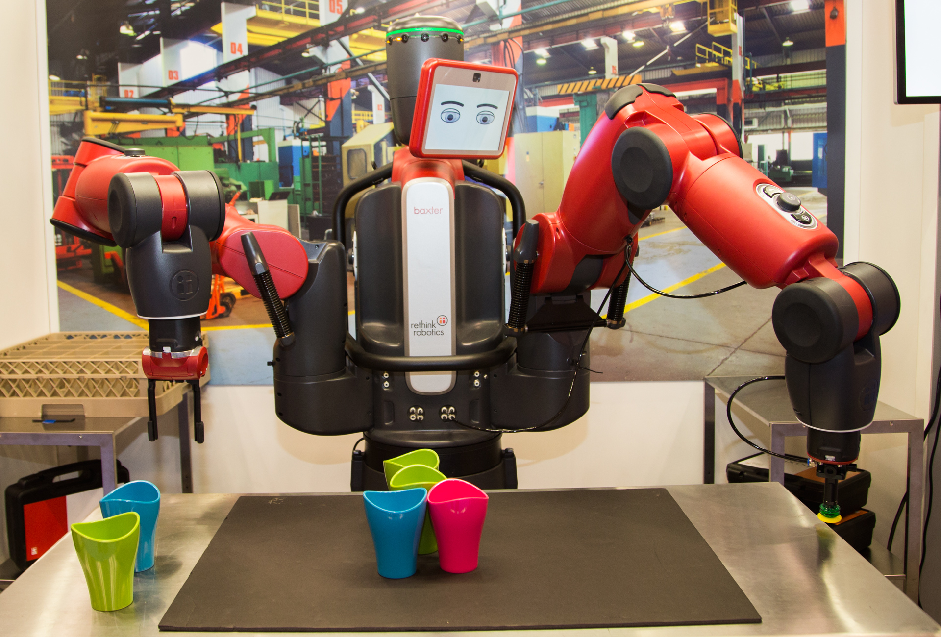 Робот Baxter - это коллаборативный многофункциональный робот с двумя манипуляторами, дисплеем и системой обратной связи. Робот может наливать кофе, собирать конструктор или передавать предметы.